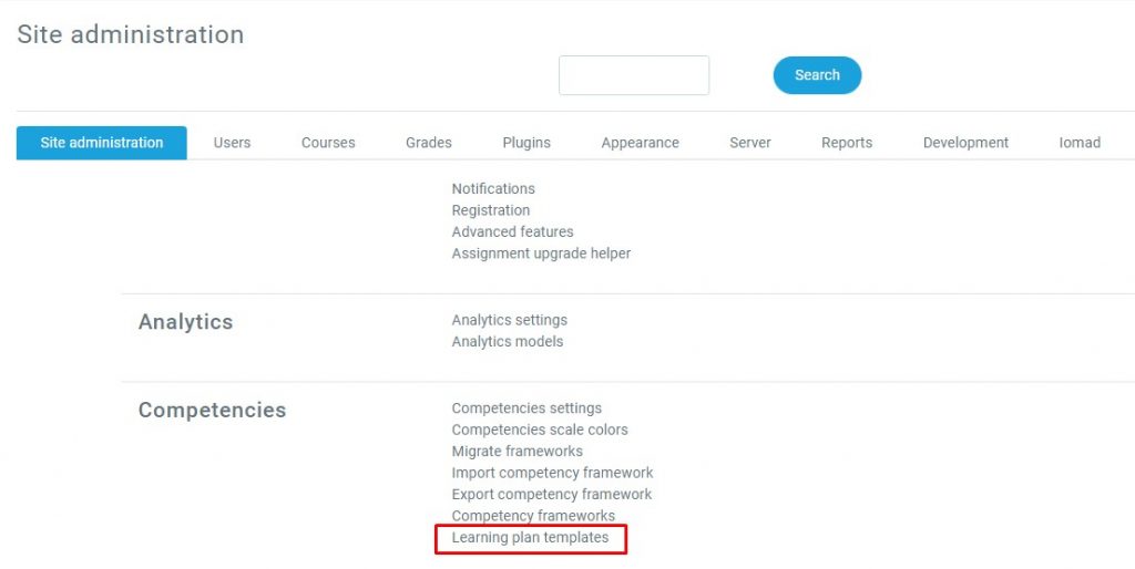 The course instructor will see a Site administration link and be able to access learning plan templates: