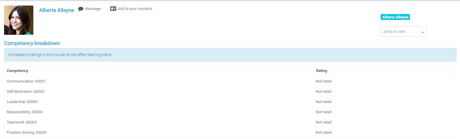 The competency breakdown report allows instructors to view the competencies of each user in their course, along with their ratings.