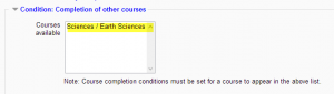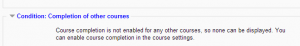 This setting allows you to make “the completion of another course” as a condition for completing the course you are currently working in. This does not block the user from your current course; it simply means that the current course will not be marked complete until the first course has been marked complete. Thus, completion of the current course is dependent upon completion of an earlier course. Just select one or more courses in the “Courses available box”.