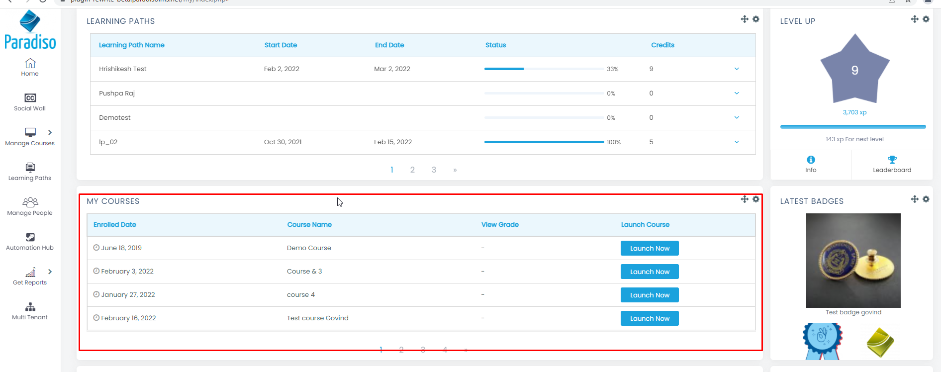 The Courses block lists and allow navigation between all of the courses in which the logged in user is enrolled in. The block title shows as “My courses” and allows one-click access to a course’s home page.