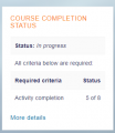 The course completion status block shows what has been done towards completing the course. The user and instructor will both see this block. The “More details” link will lead to a more detailed report. This report can have some interactive elements in the form of checkboxes for the user and instructor.