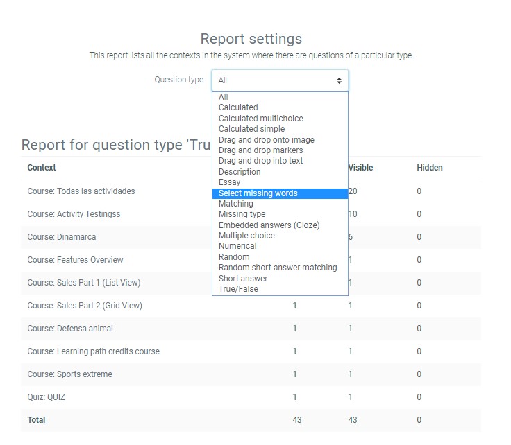 This report lists all the places a specific question type is used. It provides a list by course that shows the total, visible and hidden number of that question type. Clicking on a context link such as course title will take you to the relevant question in the question bank.