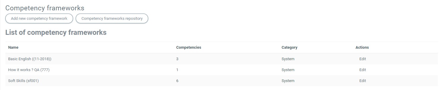 - Any existing frameworks are displayed here; you can click a button to create a new one or look in the Competency frameworks repository.