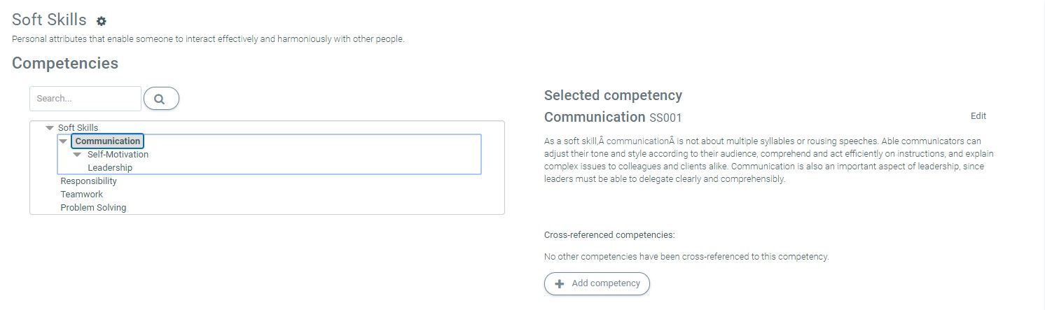 This page lets you build the tree of competencies that define your competency framework. To start adding competencies, first, click on a node in the tree (the topmost node in the tree will be the framework itself), then click on the “Add competency” button. (If you have changed the name in Taxonomies, the button will be named differently, such as “Add skill”.)