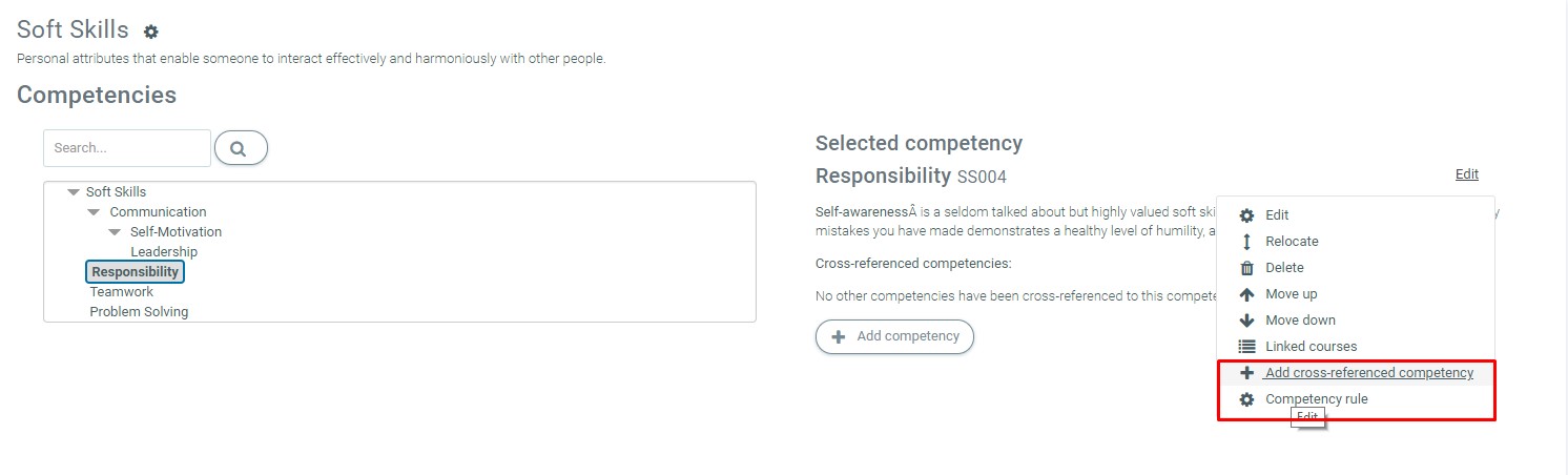 - Clicking Edit next to a competency once it has been created and selected displays other options, for example marking it as “related” to other competencies or creating an automatic completion rule. An automatic completion rule allows one competency to be completed automatically when all sub-competencies are complete.