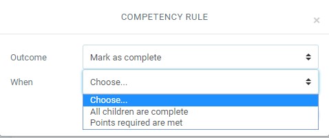 - From the new ‘When’ field, you can choose ‘All children are complete’ or ‘Points required are met’. For ‘Points required’ you can then set the points and whether or not a competency is required: