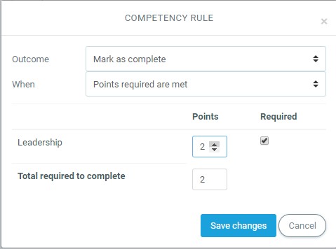 Competency rules can be added to any competency in a framework, as long as it has children. A competency rule can be used to automatically mark as complete a parent competency when all children of it are complete. Linking the child competencies to course activities combined with the competency rule ‘Mark as complete when all children are complete’ will award the parent competency to a user when he has successfully completed the course activities.