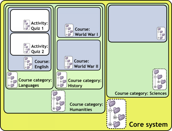 See the diagram illustrating the relationship of the different contexts below. Different colours denote different context types (though there are two hues of green, both denote the same type). Notice how question contexts contain each other. Notice also that Course category contexts can be nested. In this example, we have two contexts nested within each other ‘Humanities’ and ‘Languages’. We could have a third-course category ‘English’ and forth and so on. Course categories can be nested infinitely and so you can set up a very flexible system of question contexts for sharing questions and assigning question sharing permissions.