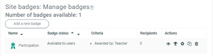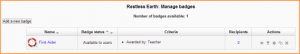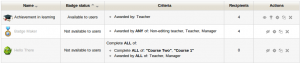 - If course badges have been enabled in Settings>Site administration>Badges>Badges settings, then an instructor will see a link Settings>Course administration>Badges>Managing badges. This will show a list of badges created and available for allocation, along with actions which may be performed on them: