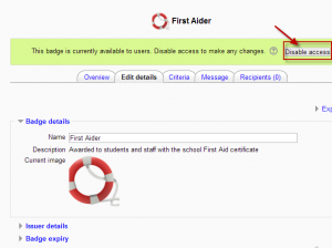If you wish to change the details of a badge once you have set it up, you must first click to “disable access”. Once you have edited the details, you must then click to “enable access” again.
