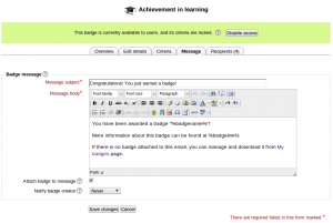 This setting allows you to edit the message which goes to a badge earner. Among additional options here are “Attach badge to message” which allows adding an image file to an email and “Notify badge creator” selector which allows the 0.setting frequency of notifications sent to badge creator when this badge is issued to users.
