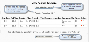 There are two ways to run the restore process ‘manually’, either by using the Process Next Restore Now button, or by visiting the LMS cron script via the url (http://yourlmssite/admin/cron.php). Running the cron via the url method, then refreshing the View Restore Schedule page should show the Currently Processing flag as ‘Yes’, if the restored class is a larger class.