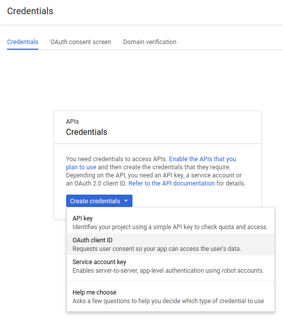 Now you can create some client credentials. Switch to the Credentials tab and create a new OAuth client ID.