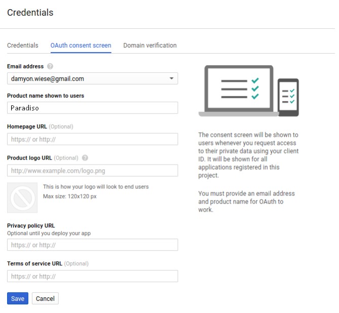 Setup the consent screen for your application. This is where you provide the public information that is shown to users when they are asked to authorize your application. Setting a product name is the minimum information that is required, but the more information you provide here – the more confidence users will have when granting this authorization.