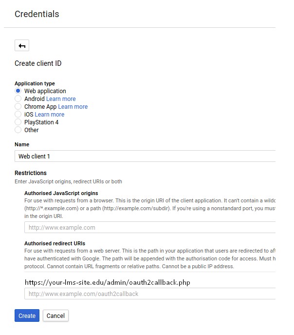 Setup the credentials for a Web Application. The most important setting here is to set the callback URL (“Authorized redirect URI”). This must be set to “your lms site URL + /admin/oauth2callback.php”. If your lms site was accessible at https://lemon.edu/ then this callback URL should be set to https://lemon.edu/admin/oauth2callback.php. Make sure this box has saved properly.