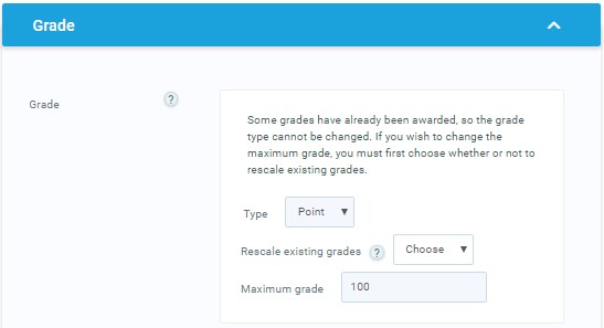 An instructor may select grade points by going to the Edit settings screen of an activity, for example, an assignment, scrolling to ‘Grade’ and then selecting ‘Point’ from the Type drop-down: