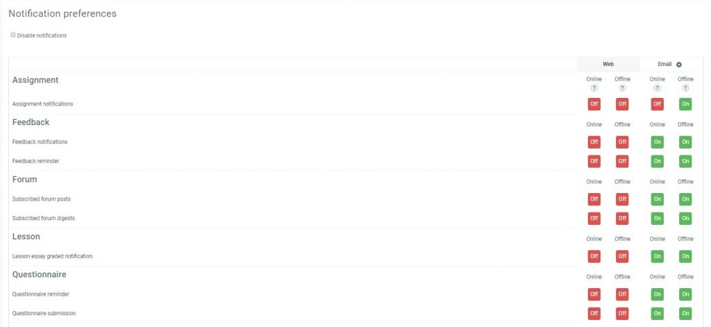 - Notifications alert instructors, students and other users about events in LMS such as new forum posts, assignments needing grading or badges awarded.