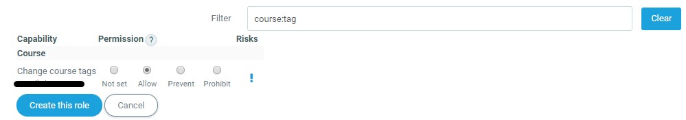 - In the filter, type ‘course:tag’ and set this to ‘Allow’ (You might need to ‘Show advanced’)