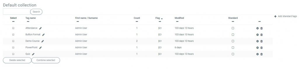 Standard tags are tags which are added by a site administrator and are available for others to use. Standard tags are never deleted during clean-up tasks even when there are no tagged items.