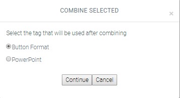 Tags with similar names may be combined by an administrator or manager by selecting them and then, from the bottom of the screen, clicking the ‘Combine selected tags’ button. A pop up will appear asking which name you want to keep, and clicking ‘Continue’ will then combine the tags: