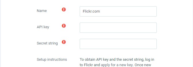 - Log in to Flickr and apply for a new API key, using the link provided on the Settings page.