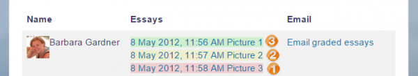 - When an instructor clicks ‘Email graded essays’ to notify the user, the color changes to a green shade – #3 in the screenshot below: