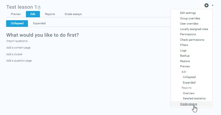 - An instructor clicking on a lesson will see tabs at the top offering them the chance to preview, edit, view reports or grade essays in the lesson: