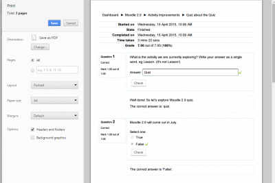 Use your browser printer option (for example by right-clicking and selecting Print) When a user prints their finished quiz, responses, and feedback will also be printed.