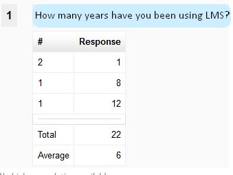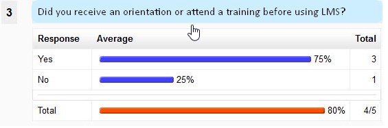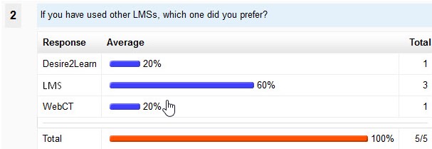 The bottom table displays for each feature the number and percentage of respondents who selected each choice. For instance, for the “Formatting your course” feature, 3 respondents (60% of respondents to that question) selected the “Very easy to use” choice, and 2 respondents (40% of respondents to that question) selected the “Easy to use” choice. Nobody selected the “Difficult” choices for that feature.