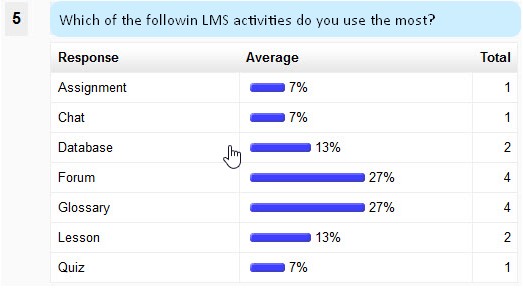 This screenshot shows for instance that the Forum and Glossary activities are favoured by 4 respondents (out of 5 who responded), accounting for 27% of the choices each.