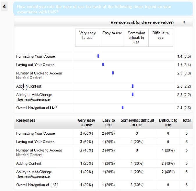 The top table displays the Average rank for each feature. In this screenshot, the “Formatting your course” feature of LMS was rated on average 1.4 on the 1 to 4 scale of difficulty, i.e. that feature was rated as between “Very…” and “Easy…” to use.