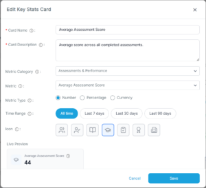 The Dashboard Key Stats Cards feature provides a quick snapshot of key LMS performance metrics on the Dashboard.