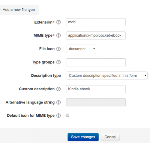 - Clicking the edit icon next to a file type will allow you to change certain details, for example, the associated icon and description. If you don’t wish to use the default description, you can specify your own custom description (with multi-language tags if your site supports multi-languages) or you can use an alternative language string from mimetypes.php.