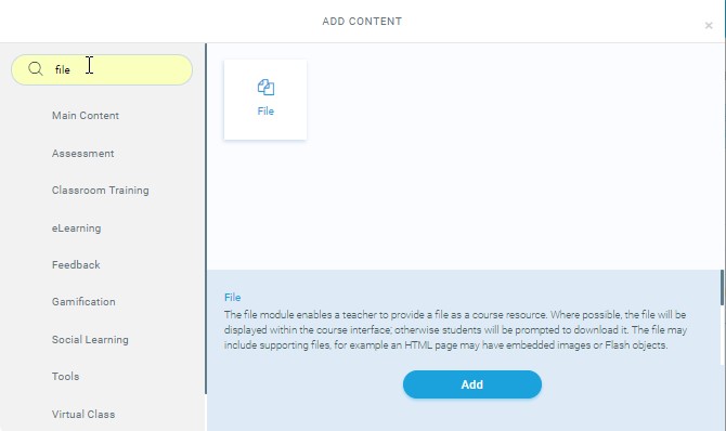 - The screen for uploading and displaying a file (or folder of files) includes an “add” button. Clicking on this button takes you to the File picker which is the name given to the file storage and access area within LMS. Find out more about the places you can upload or add files from in the File picker page.