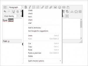 While the default spell engine is Google spell which can be changed in Settings >Plugins>Text editors>TinyMCE HTML editor, this is no longer supported by Google and will not work. (Note that it is only visible in IE9 and lower) It is due to be removed. In browser spell check is recommended.