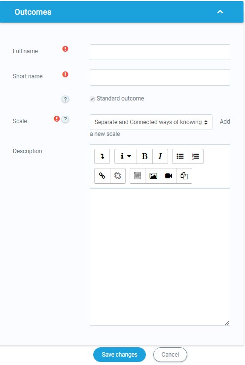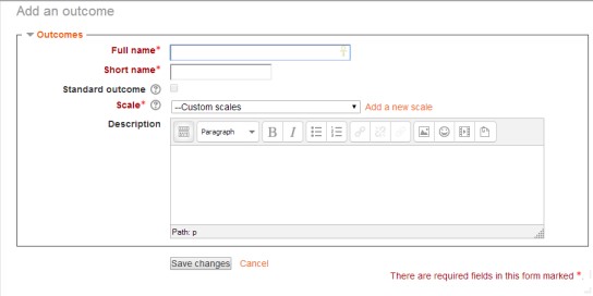 An administrator can add standard outcomes, which are available site-wide, in Settings > Grades > Outcomes. Multiple standard outcomes can be added using the import outcomes functionality (see below).