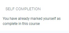 The self-completion block provides a link for users to manually declare that they have completed the course. This may be used on its own as the sole condition for completion or may be part of multiple conditions. See Course completion for more.