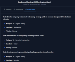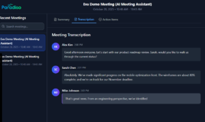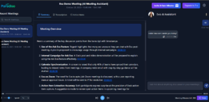 5) Eva AI Assistant chat: Access previous meeting transcripts and engage with your assistant for further assistance, making it easy to revisit important discussions
