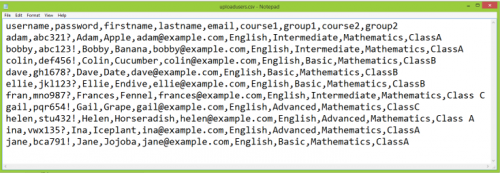 The CSV file will also upload users directly into courses and groups within those courses. In the example below, new users are added to the site and enrolled in specified groups in two courses, English and Mathematics. (The courses need to exist already, but if the groups do not already exist, LMS will create them on upload.)