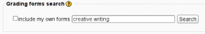 Instead of defining the new grading form from scratch, you can use some existing form as the initial template to create it from. When clicking the ‘Create new grading form from a template’ icon, a new page opens and you can search for a grading form there. Simply type words that should appear somewhere in the form name, its description or the form body itself. To search for a phrase, wrap the whole query in double quotes.