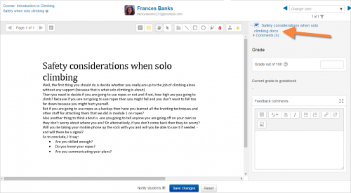- Users can upload one or more files of any type the instructor can open. The instructor can annotate uploaded PDFs, docx and odt files within the browser, and on saving, the annotated file is made available to the user. (Check with your admin that Ghostscript and a document converter are enabled, if you can’t annotate uploaded files.) In the screenshot below, a docx file has been uploaded and converted so that the instructor may use the annotation tools to comment directly on the user’s assignment.