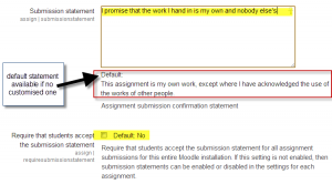 - An administrator can define a “Submission statement”, ie, a statement where users promise the work is their own and which they must agree to before submitting their work. This may be done via Site administration>Plugins>Activity modules>Assignment. (A default statement is also available.) If the administrator has given instructors the option of using a submission statement or not, then it will be available in the assignment settings screen. If the administrator has forced the statement throughout the site, an instructor will not have this option in the settings but a user will see the statement when accessing their assignment.