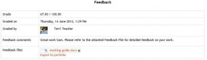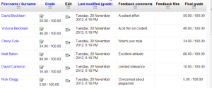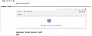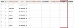 - This allows markers to upload files with feedback when marking. These files may be the marked up user assignments, documents with comments, a completed marking guide, or spoken audio feedback. It enables the Feedback Files column in the assignment grading screen (accessed from ‘View/Grade all submissions’.) To upload feedback files, click on the green tick in the grade column on the grading table and then upload either with drag and drop or using the File picker.