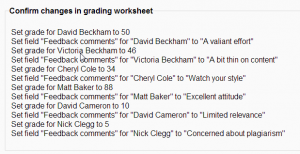 When the instructor has completed their grading offline, they can then upload the spreadsheet, confirm the changes and the grades and comments will be transferred over into LMS’s gradebook: