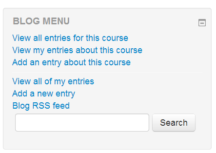 If blog associations are enabled, users can blog about their course or a particular activity using the context-sensitive links for adding an entry in the Blog menu block e.g. ‘Add an entry about this assignment’ or ‘Add an entry about this course’.
