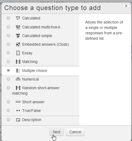 2. From the next screen, choose the question type you want to add and click “Next” (‘When you click on a question type on the left, helpful information appears on the right. )