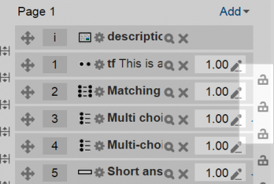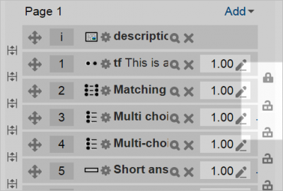 - In the following example, note that Q1 follows a description, and a description ‘questions’ cannot be finished. Therefore, Q1 cannot depend on the previous question. Similarly, Q4 follows an Essay question. The Essay cannot be finished during the attempt, so the following question cannot depend on it. Note the lack of padlocks in the following screenshot because of the description and Essay question: