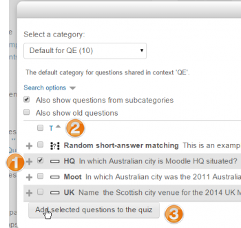 - If you have several questions, or you want to add all the questions, tick the box of each question or the top box (2 in the screenshot below) and then click ‘Add selected questions to the quiz’ (3 in the screenshot below).