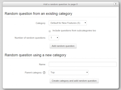 As long as you have questions in the question bank, you can add random questions to your quiz by clicking ‘Add’ and then ‘+ a random question’. This might be useful if you have users in a class taking a quiz at the same time because they are unlikely to get the same questions at the same time. The same question will never appear twice in a quiz. If you include several random questions then different questions will always be chosen for each of them. If you mix random questions with non-random questions then the random questions will be chosen so that they do not duplicate one of the non-random questions. This does imply that you need to provide enough questions in the category from which the random questions are chosen, otherwise the user will be shown a friendly error message. The more questions you provide the more likely it will be that users get different questions on each attempt. When a quiz with random questions is retaken, the random questions will be different from the ones in previous attempts.