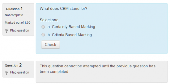 - If using the Interactive with multiple tries or Immediate Feedback behavior and with the navigation method set to ‘Free’, it is possible to make the display of a question dependent on a previous question being answered first.